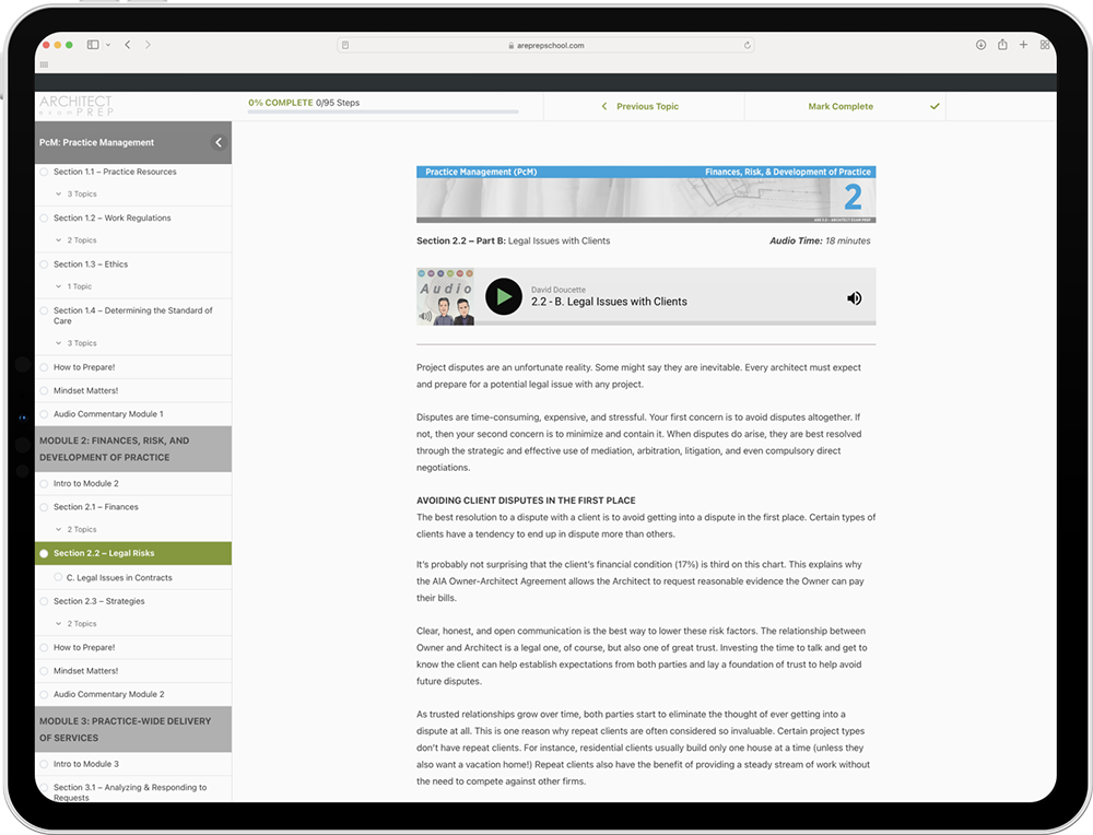 Our PPD study package is a comprehensive, affordable solution covering everything needed for this demanding division. It highlights the connections between topics and how they affect your decision-making, helping you understand exactly what the questions are asking. The study guide follows the structure of the NCARB exam and is written in clear, accessible language. The Audio Companion allows you to listen and follow along from anywhere, with real-life examples that make concepts memorable. The 3 Case Study Guide prepares you for the exam’s case studies with realistic project documents, while hundreds of digital flashcards and a timed exam simulator provide interactive practice, instant feedback, and scoring so you can assess your readiness.